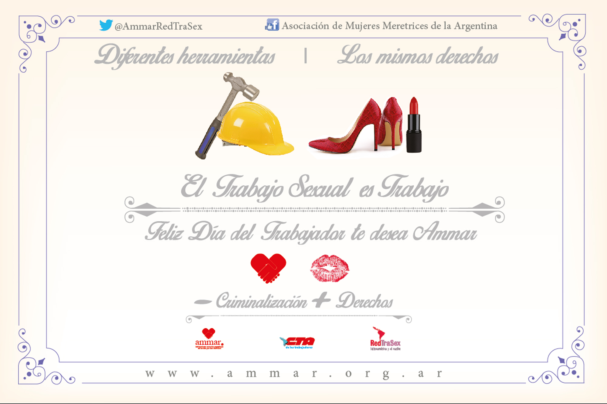 En el marco del Día Internacional de los Trabajadores, la Asociación de Mujeres Meretrices de la Argentina Ammar, envió a periodistas, senadores, legisladores y diputados postales en las que compara diferentes herramientas laborales con las utilizadas en el Trabajo Sexual. “Diferentes herramientas, los mismos derechos” se lee en la imagen. A la entrega sumó una boleta de Monotributo simbólica por concepto de un “servicio sexual completo” que lleva la frase “Así facturaríamos si se reconociera nuestro trabajo”.